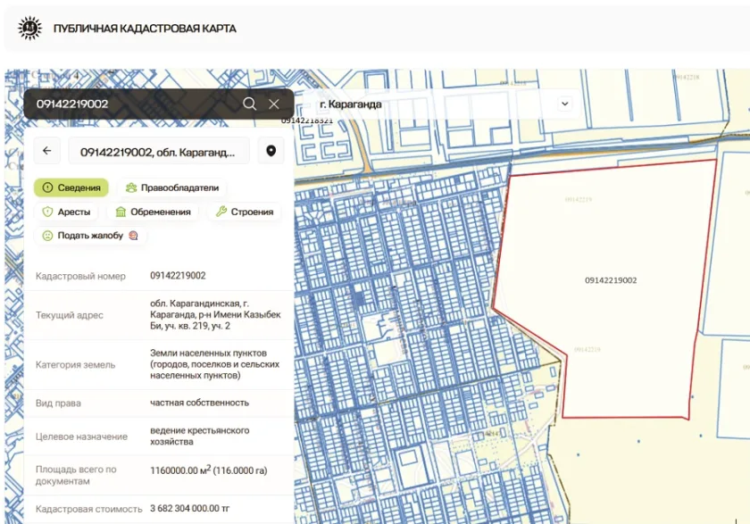 Параллельно с киоском градоначальник покусился на более жирный кусок – 116 га земли на окраине Караганды, рядом с частным сектором. Участок, судя по его расположению на карте, как нельзя лучше подходил под то, чтобы его распилить по 10 соток и выгодно пристроить не только среди очередников. Продан он был в частную собственность для ведения крестьянского хозяйства. Обратите внимание на кадастровую стоимость, указанную на публичной кадастровой карте — 3 682 304 000 тенге.