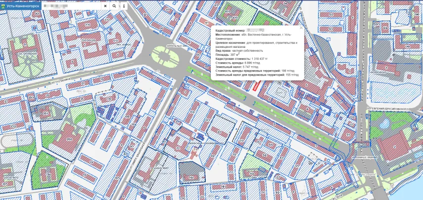 Что удивительно, так это то, что комментаторы, как в воду глядели. Так как кадастровый номер земельного участка, в непосредственной близости от которого рубили деревья, может многое рассказать в официальном же государственном источнике – геопортале Восточного Казахстана. Там прямо указано, что этот кусок земли в центре (где она на вес золота) уже находится в частной собственности. И его целевое назначение – для проектирования, строительства и размещения магазина.