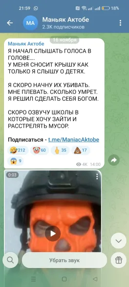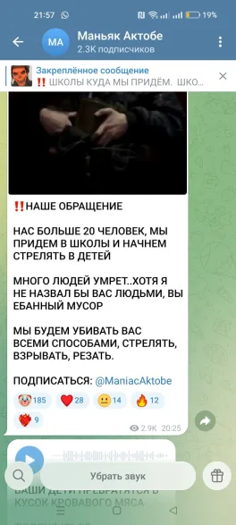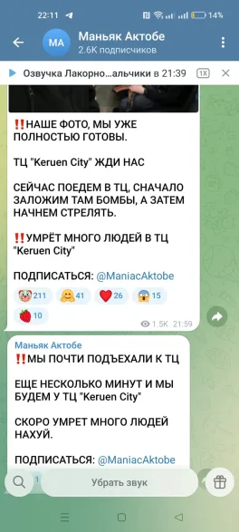 После этого автор канала стал постить сообщения о том, что он с командой собирается устроить взрыв в одном из торговых центров Актобе. Неизвестные выложили видео из торгового центра и фото.