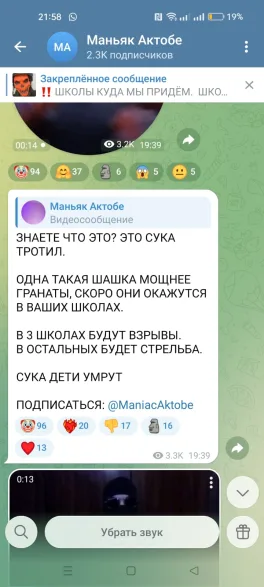 Далее автор угроз выложил список всех школ Актобе, куда якобы явится для расправы. После этого выложил видео с тротилом и как неизвестные в балаклавах позируют со взрывчаткой.