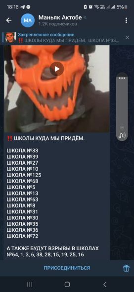Далее автор угроз выложил список всех школ Актобе, куда якобы явится для расправы. После этого выложил видео с тротилом и как неизвестные в балаклавах позируют со взрывчаткой.