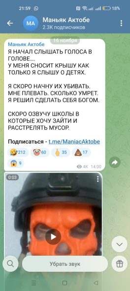 Сообщения из этого канала в воскресенье, 16 ноября, стали быстро разлетаться по школьным чатам. Вот одно из сообщений: «Я начал слышать голоса в голове… У меня сносит крышу, как только слышу о детях. Я скоро начну их убивать. Мне наплевать, сколько их умрёт. Я решил сделать себя Богом… Скоро озвучу школы, в которые хочу зайти и расстрелять мусор».