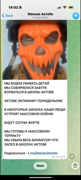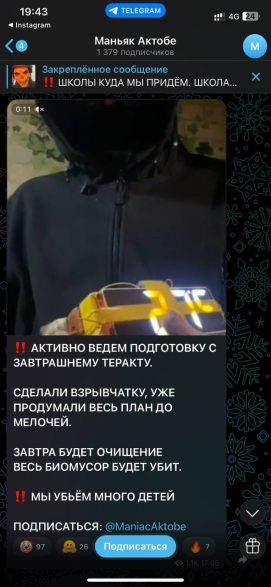 После этого автор канала стал постить сообщения о том, что он с командой собирается устроить взрыв в одном из торговых центров Актобе. Неизвестные выложили видео из торгового центра и фото.