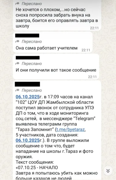 6 октября в мессенджерах распространили сообщение, в котором говорится о намерении неких лиц совершить теракты в школах Тараза.