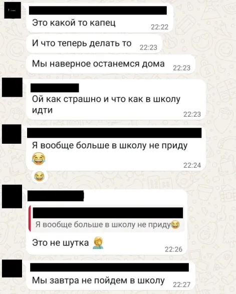 Это сообщение и, возможно, информация канала, которую смогли посмотреть родители учащихся, когда он еще был доступен, наделали много шума. Как известно, в каждом классе каждой школы каждого населенного пункта имеются родительские чаты. Вот в них и началась бурная переписка: родители задают вопросы, на которые нет ответов. Многие из них пишут, что завтра не отпустят своих детей в школу. Побоялись идти на работу и многие учителя.