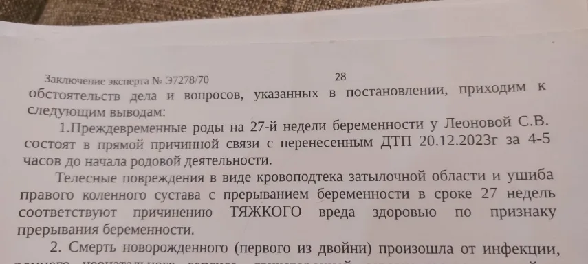 Вторая девочка, проведя два месяца в реанимации, к счастью, выжила, но ей понадобилась операция на глазки, также были проблемы со слухом. Как подтвердила экспертиза, преждевременные роды были вызваны именно ДТП.