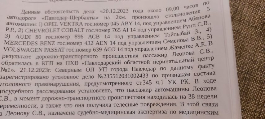Утром 20 декабря 2023 года Светлана ЛЕОНОВА (на снимке), находящаяся на 26‑й неделе беременности (в полиции зачем‑то указали, что на 38‑й), ехала с таксовавшим односельчанином Рахматуллой АБЕНОВЫМ на его автомобиле Opel из пригородного села Кеменгер в Павлодар в поликлинику. Opel выехал на встречку, столкнулся с автомобилем Mercedes под управлением Валентина СЕМЁНОВА (на снимке). Валентин, студент университета им. Торайгырова, ехал по своей полосе со скоростью 40 км/ч. Увидев Opel, он попытался избежать удара, уйдя на обочину, но Абенов направил автомобиль туда же. От удара об Mercedes Opel развернуло, и он ударил идущий следом по той же полосе новенький Chevrolet. Его ещё раз развернуло, и он задел идущий по своей полосе Volkswagen, в который въехала Audi. В автомобиле Volkswagen сын вёз в город в поликлинику своего парализованного отца. Инвалид при ударе сломал ключицу. Валентин потерял сознание. Повезло, что у Mercedes согнуло колесо и он не вылетел с трассы – иначе был бы летальный исход. У Светланы, получившей синяки и ссадины, через четыре часа начались преждевременные роды.