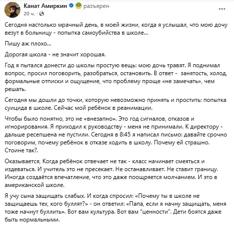 Год я пытался донести до школы простую вещь: мою дочь травят. Я поднимал вопрос, просил поговорить, разобраться, остановить. В ответ — занятость, холод, формальные отписки и ощущение, что проблему проще не замечать, чем решать. Сегодня мы дошли до точки, которую невозможно принять и простить: попытка суицида в школе. Сейчас мой ребёнок в реанимации”, — пишет Канат Амиркин.