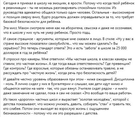 Эта мисс Махон смотрела на меня как на аборигена, свысока, и даже не осознавая, что в школе у них чуть не умер ребенок. И самое страшное — аргументы, которые мне сказали в лицо. В стиле: «Ну у вас в стране высокие показатели самоубийств… что мы можем сделать?» Вы серьёзно? Это теперь стандарт ответа? Это и есть “забота” в школе за 25 000 долларов в год за ребёнка?”, — возмущается Канат Амиркин.