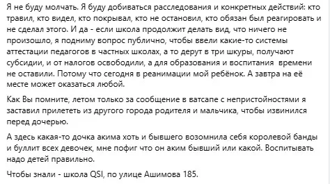 “Если школа продолжит делать вид, что ничего не произошло, я подниму вопрос публично, чтобы ввели какие-то системы аттестации педагогов в частных школах, а то дерут в три шкуры, получают субсидии, и от налогов освободили, а для образования и воспитания времени не оставили. Потому что сегодня в реанимации мой ребёнок. А завтра на её месте может оказаться любой. А здесь какая-то дочка акима, хоть и бывшего, возомнила себя королевой банды и буллит всех девочек. Воспитывать надо детей правильно”, — резюмирует Канат Амиркин.