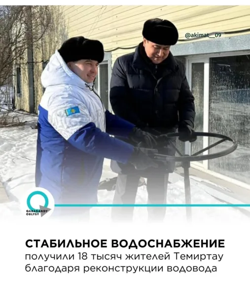 8 января водопровод торжественно запустили в присутствии акима города Галыма АШИМОВА. В сообщении акимата области говорится, что воду оттуда получают 18 тысяч жителей Темиртау.