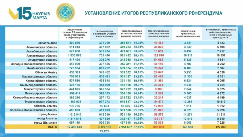 — При этом в каждом регионе большинство граждан поддержали данное решение. Таким образом, требование законодательства о республиканском референдуме о поддержке положительного решения более чем половиной проголосовавших граждан не менее чем в двух третях из 20 регионов страны было соблюдено. В связи с этим новая Конституция признаётся принятой, — сказал Нурлан Абдиров.