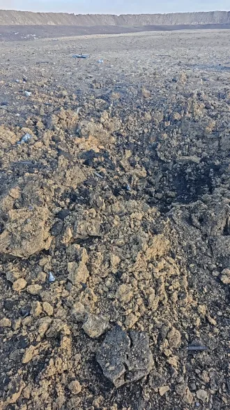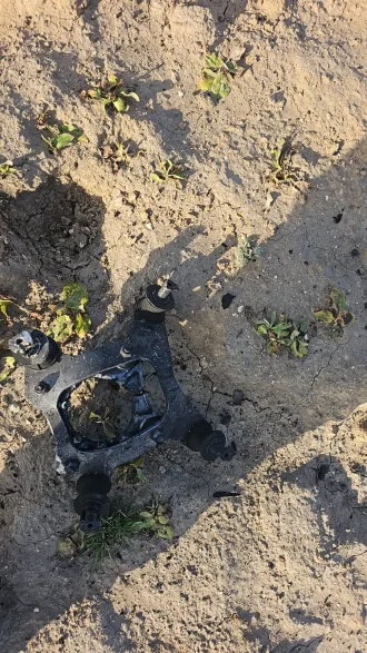 На фото также видно, что в земле образовалась небольшая воронка, а на раскиданных запчастях – надпись на украинском языке.