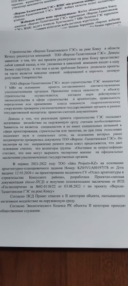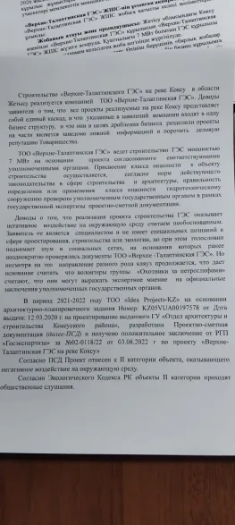 Представитель ТОО «Казархеология» предоставил нам письменный ответ, в котором сказано, что Верхне-Талаптинская ГЭС не наносит негативного влияния на окружающую среду, а волонтеры движения «Охотники за приведениями» занимаются распространением кляуз.