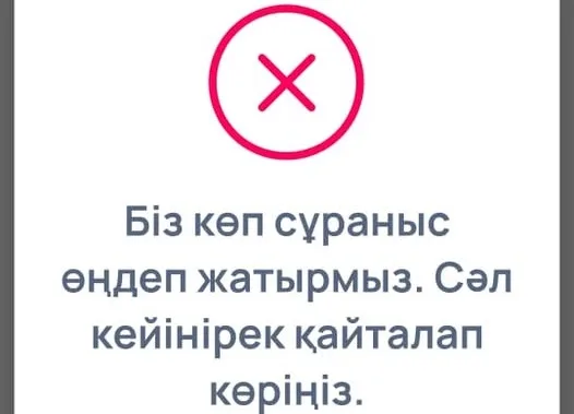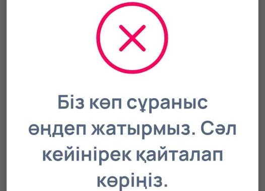Банк қосымшасы әрең дегенде бір ашылса, оның өзінде «Біз өте көп сұраныс өңдеп жатырмыз. Сәл кейінірек қайталап көріңіз…», деген хабарлама шығып тұр.