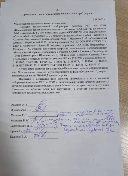 К слову, спустя время, комиссия снова выехала на место, чтобы снова взять керны. Там присутствовали представители заказчика, подрядчика, маслихата и Комитета автомобильных дорог. И тут началось самое интересное:
