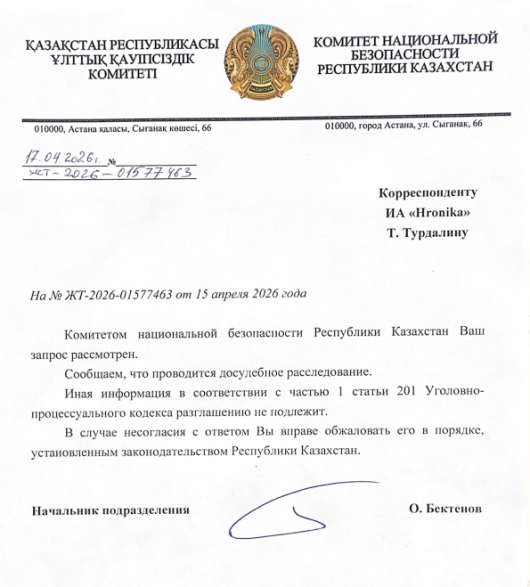 «Комитетом национальной безопасности Республики Казахстан Ваш запрос рассмотрен, — сообщил в своем ответе руководитель аппарата председателя Олжас БЕКТЕНОВ. — Сообщаем, что проводится досудебное расследование».