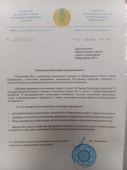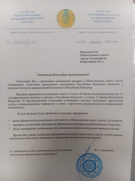 В документе, датированном от 2 октября этого года, говорится о том, что Агентство по финансовому мониторингу и КНБ планируют проверить финансовую деятельность общественного совета и их членов на предмет отмывания бюджетных средств и коррупции.
