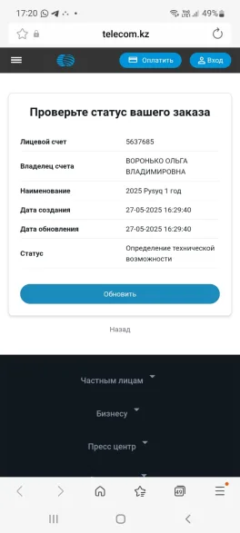 Но проблема в том, что лично я пытаюсь избавиться от медной линии с мая этого года – с тех пор, как стала владелицей квартиры. В статусе моего заказа под номером 80000954 от 27 мая на странице национального оператора связи вот уже полгода указано: «Идет определение технической возможности».