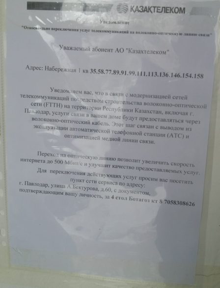 На всех пяти подъездах моего дома, расположенного в центре Павлодара, появилось предупреждение, что те, кто все еще пользуется устаревшей медной линией, должны одуматься и явиться с документом, удостоверяющим личность, в офис АО «Казахтелеком», чтобы уже переключиться на волоконно-оптическую линию. А медная будет оптимизирована в связи с модернизацией сетей телекоммуникаций и выводом из эксплуатации автоматической телефонной станции. Новая линия, сказано в объявлении, позволит увеличит скорость интернета до 500 Мбит/с и улучшит качество предоставляемых услуг. Там же указан и телефон девушки Ботагоз, сидящей за четвертым столиком, к которой нужно обратиться.