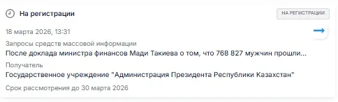 Наш запрос 18 марта поступил в ГУ «Администрация Президента Республики Казахстан», срок рассмотрения был указан до 30 марта.