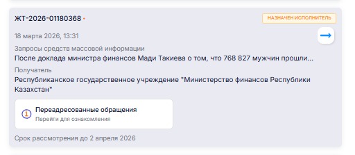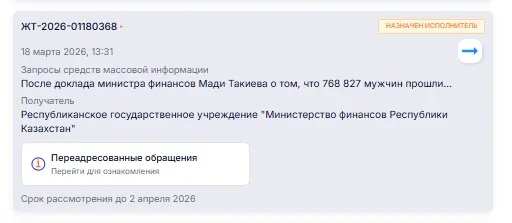 В тот же день запрос был переадресован в ГУ «Министерство финансов Республики Казахстан» со сроком рассмотрения до 2 апреля.