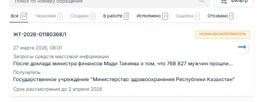 27 марта запрос был переадресован в ГУ «Министерство здравоохранения Республики Казахстан».
