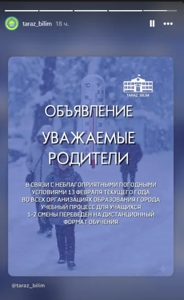 Отдел образования Тараза в первый день снегопада анонсировал переход на дистанционное обучение учащихся первой смены. А вчера, 12 февраля, и сегодня на онлайн-обучение отправили всех учащихся.