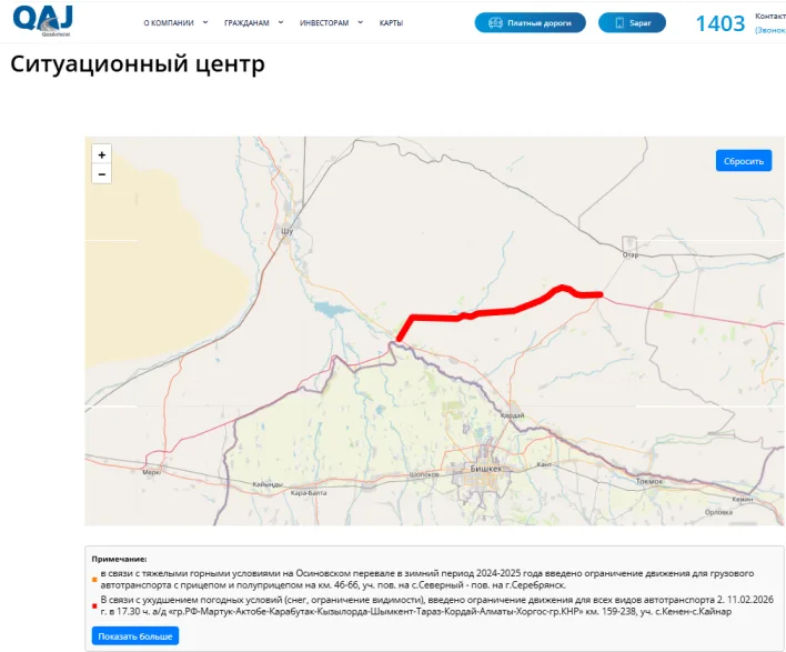 «В связи с ухудшением погодных условий (снег, ограничение видимости), введено ограничение движения для всех видов автотранспорта участок от села Кенен до села Кайнар», — говорится на сайте Казавтожола.