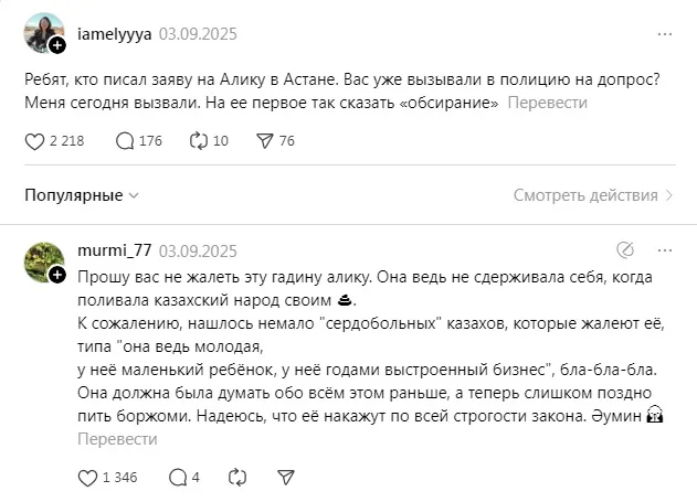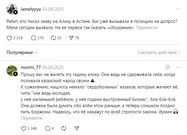 «Ребят, кто писал заяву на Алику в Астане, вас уже вызывали в полицию на допрос? Меня сегодня вызвали. На её первое, так сказать, «обсирание».