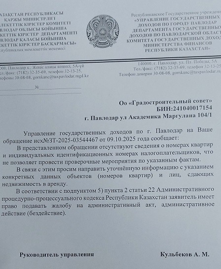 С последним вопросом Нургуль обратилась в управление госдоходов по городу Павлодару. Руководитель управления Асет КУЛЬБЕКОВ ответил: «В представленном обращении отсутствуют сведения о номерах квартир и индивидуальных идентификационных номерах налогоплательщиков, что не позволяет провести проверочные мероприятия по указанным фактам. В связи с этим просим направить уточнённую информацию с указанием конкретных данных объектов (номеров квартир) и лиц, сдающих недвижимость в аренду».