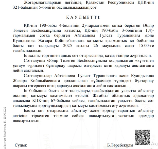 В суде, согласно постановлению о начале главного судебного разбирательства от 13 июня 2025 года, участвует 13 потерпевших, тогда как в обвинительном акте старшего следователя управления полиции Тараза НИЯЗБЕКА Ә.С., утвержденном прокурором областного центра Нуржаном БОРАНБАЕВЫМ, потерпевшими числятся 28 человек.