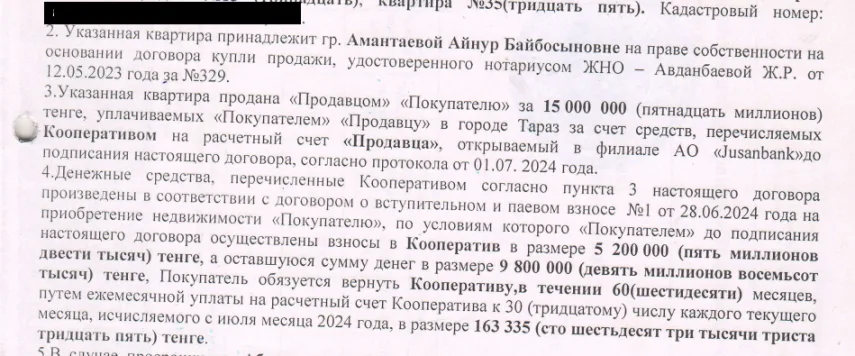 Об этом в договоре написано замудрённо: «Указанная квартира продана «Продавцом» «Покупателю» за 15 000 000 тенге, уплачиваемых «Покупателем» «Продавцу» в городе Тараз за счет средств, перечисляемых Кооперативом на расчетный счет «Продавца».