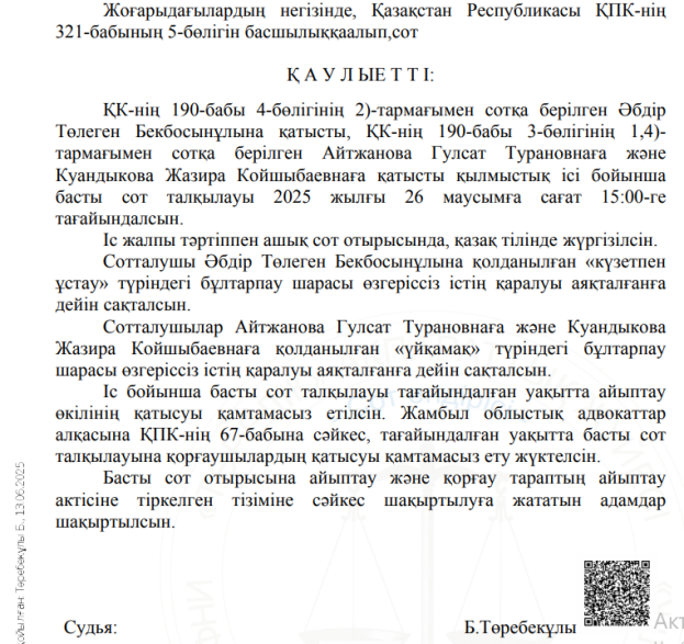 Дело по подозрению в мошенничестве в крупном и особо крупном размере главы потребительского кооператива «Сенім недвижимость» и двух его подельниц рассматривает судья Бағдат ТӨРЕБЕКҰЛЫ с начала лета.