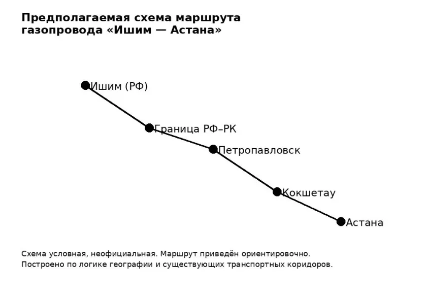 Маршрут пройдет через Петропавловск и Кокшетау. По словам посла Казахстана в России Даурена АБАЕВА, «согласно предварительно определённым срокам, газопровод должен заработать с 1 января 2030 года».
