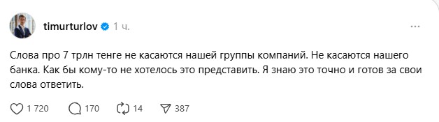 «Слова про 7 трлн тенге не касаются нашей группы компаний. Не касаются нашего банка. Как бы кому-то ни хотелось это представить. Я знаю это точно и готов за свои слова ответить», — подчеркнул Турлов.