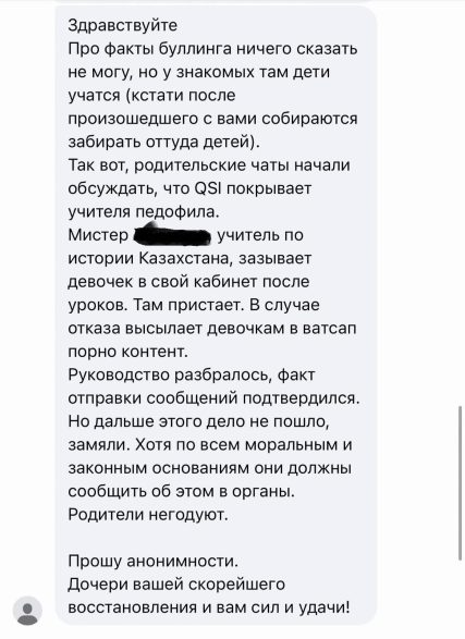 “Среди сообщений есть и крайне тревожные утверждения о возможных эпизодах сексуализированного поведения со стороны взрослого и рассылке несовершеннолетним запрещённого контента (со слов родителей). О таком похожем случае в школе QSI Astana недавно писала Айжан Хамит.