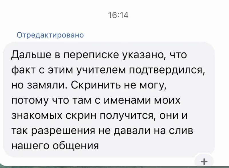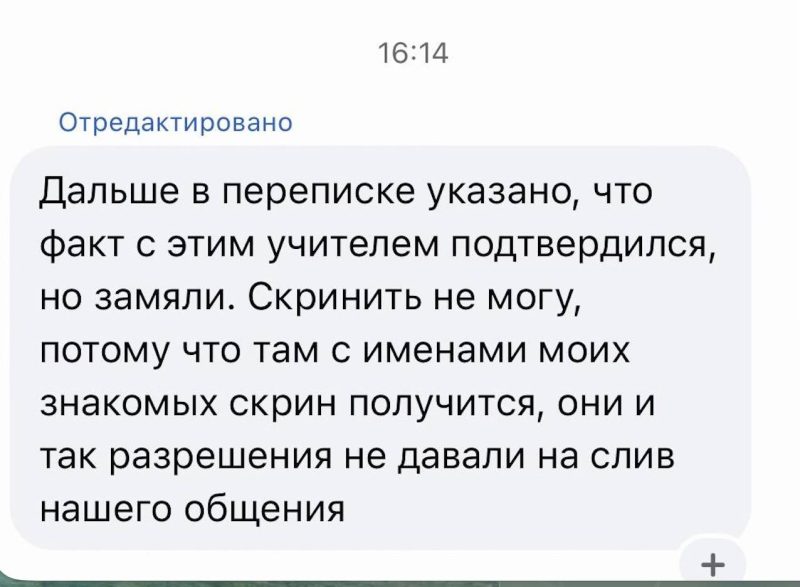 К своему посту автор также прикрепил скрины сообщения, в котором говорится, что один из преподавателей зазывает девочек в свой кабинет после уроков и там пристает, а в случае отказа — присылает им порноролики. Руководство школы разбиралось в случившемся и даже подтвердило факт отправки таких сообщений, однако дальше этого дело не пошло — ситуацию также “замяли”.