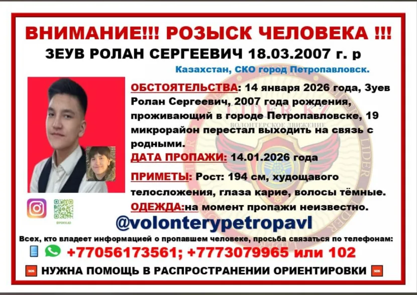 О судьбе 18-летнего Ролана ЗУЕВА не было известно больше двух недель. Проживал он в 19-ом микрорайоне Петропавловска, работал в кафе. Ролан перестал выходить на связь 14 января. В социальных сетях и местных СМИ появились объявления о пропаже худощавого молодого человека высокого роста, 1 метр 95 см.
