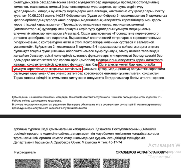 – Для предоставления вам коляски с электроприводом у вас нет показаний, – написал в ответе на его обращение глава департамента Аслан ОРАЗБЕКОВ.