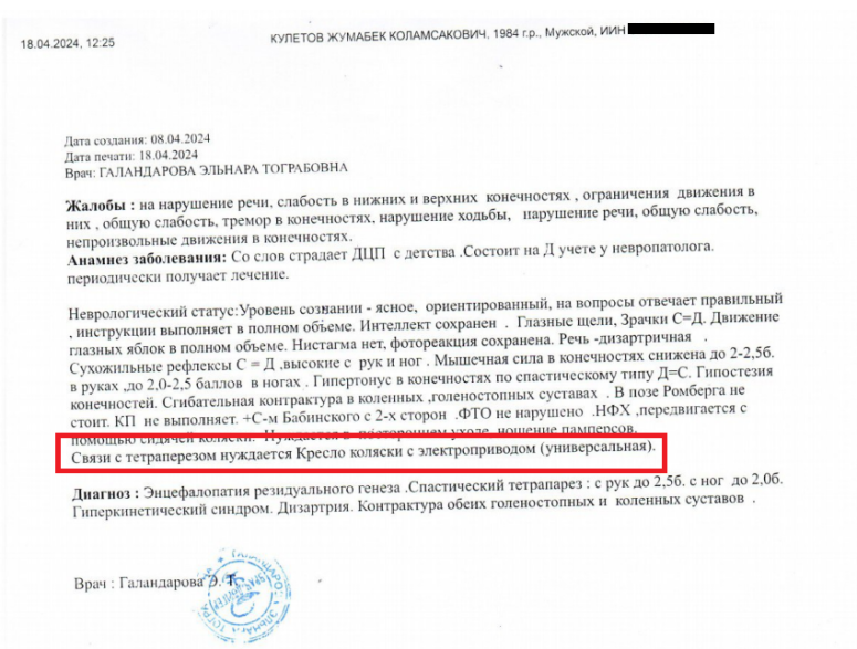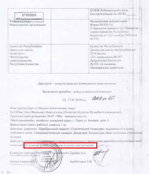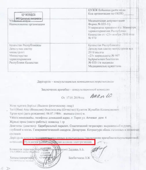 О необходимости в получении коляски с электронным управлением ранее указывали в своих выводах врачи родной для Жумабека поликлиники №9 – врач-невропатолог и члены ВКК (врачебно-консультационной комиссии – Т.Т.). Они оба написали чёрным по белому: нуждается в коляске с электроприводом.