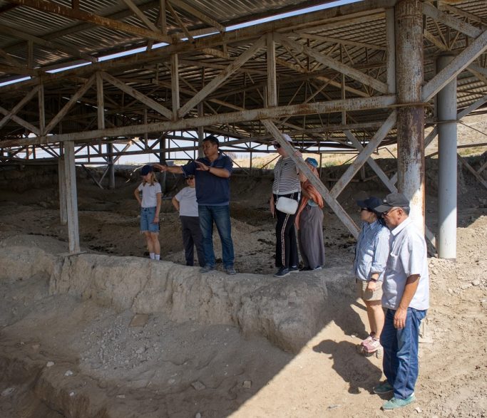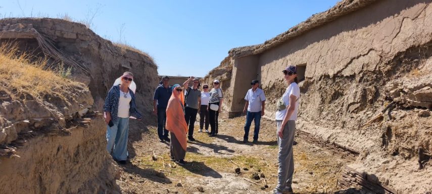 Все эти работы могу оценивать только как зритель, видевший разные реконструкции разных городищ. К примеру, примерно такой же компанией путешественников побывали в Ферганской долине. Там, недалеко от города Намангана находится городище Ахсикент. Очень похожи истории этих двух городищ – оба города процветали в средневековье, оба крупные для того исторического периода, оба находятся у реки, дворцовая часть и там, и тут расположена на холме. Но наманганский масштаб археологических работ посетителей просто потрясает. Над раскопками возведены ангары, объекты снабжены qr-кодами, везде проложены помосты и лестницы, чтоб посетители случайно не разрушили вскрытый археологами средневековый ландшафт. Да и ходить по помостам удобнее, нет риска переломать ноги на крутых спусках-подъемах. Внутри каждого ангара образована выставка находок. Впечатляет. Фото (оно выше) демонстрирует только малую часть и только в одном ангаре.