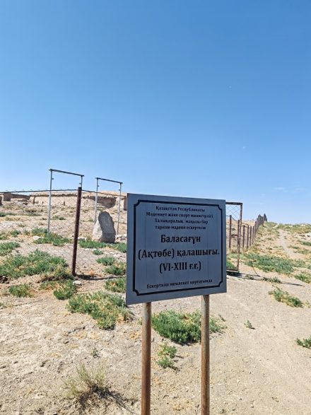 Исследованная часть, там где были раскопки, обнесена забором. И есть табличка с надписью: «Городище Баласагун (Актобе), VI-XIII в.в». Коротко, ясно и без сомнений.