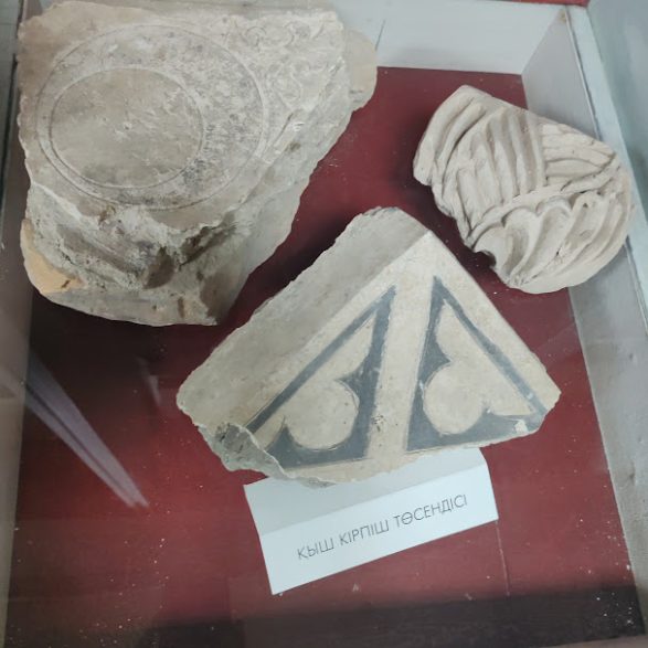 Потом поехали в село Шу, там в местном краеведческом музее есть целый зал, посвященный археологическим находкам городища Актобе. Кувшины, керамические столы, хумы, кирпичи. На строительных кирпичах видна рука мастера – он проводил пальцами по сырой поверхности и оставлял на кирпиче волнистые отпечатки. Получалось что-то вроде клейма. На отделочных сохранились рисунки, орнаменты, фигурки… Красиво.