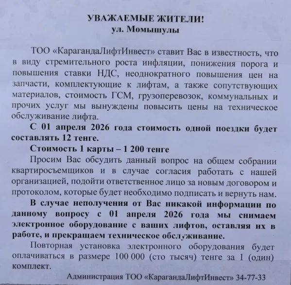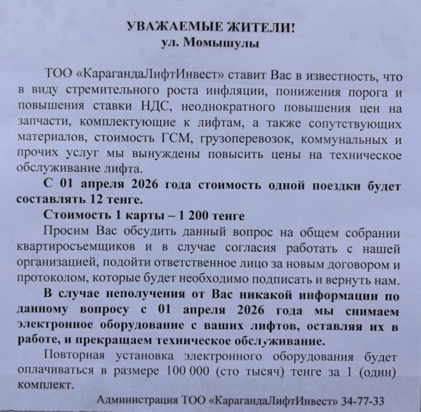 «В виду стремительного роста инфляции, понижения порога и повышения ставки НДС, неоднократного повышения цен на запчасти», — именно с таких слов начинается объявление ТОО «КарагандаЛифтИнвест» о повышении стоимости обслуживания лифтов.