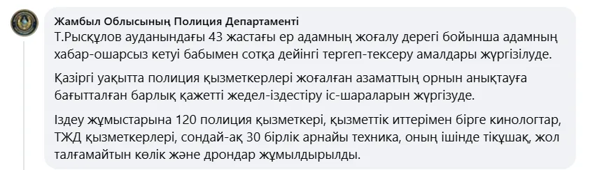 О пропаже мужчины сообщил жамбылский журналист Мадияр ЕРАЛЫҰЛЫ.