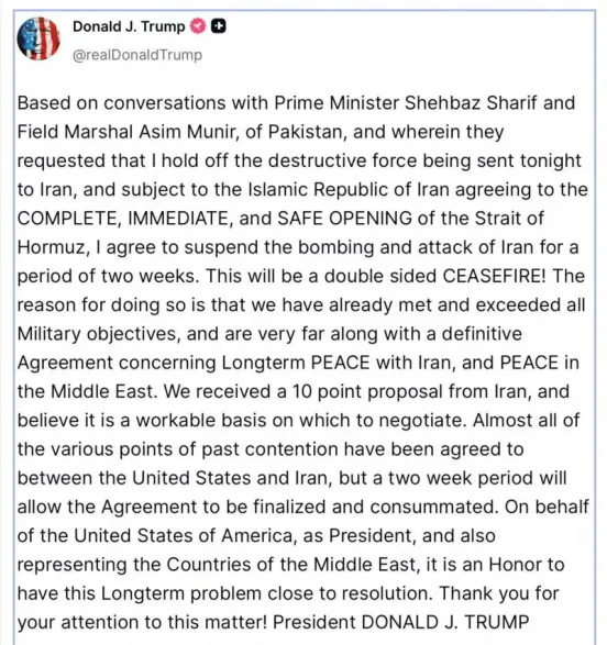 По его словам, он получил от Ирана «предложение из 10 пунктов», которое считает «рабочей основой для переговоров». По словам Трампа, эти две недели необходимы для того, чтобы договориться об окончательном соглашении.