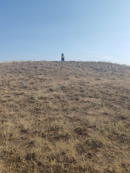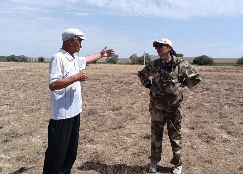 И мы попрощались с хозяевами и поехали. Но не сразу направились в Алматы. Отправились в Бес Тобе – это пять курганов сакского времени. С нами поехали аким Мусабекского сельского округа Ербол ТАНТЫБАЙ с водителем – они и показывали дорогу. Ербол, кстати, – прямой потомок Оракты батыра.