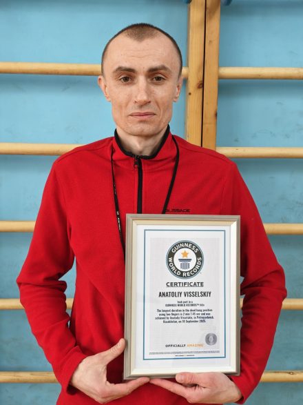 В самой Книге указано так: «Наибольшая продолжительность пребывания в положении виса на двух пальцах». Результат – 2 минуты 7,45 секунды, продемонстрированный 34-летним Анатолием ВИСЕЛЬСКИМ, является мировым рекордом. Если ранее педагог из Петропавловска бил рекорды по вису на пальцах на турнике неофициально, то теперь всё зафиксировано в Книге.