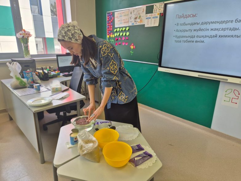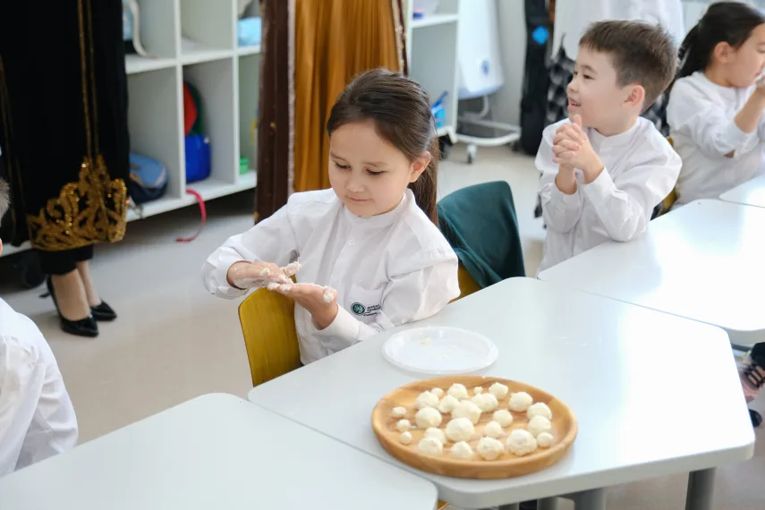 А в другом классе малыши восторженно наблюдают за тем, как готовится казахское лакомство — жент.